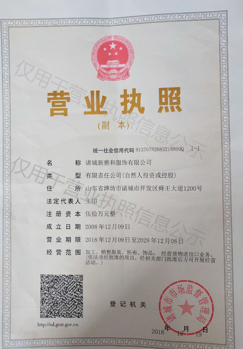 諸城新雅和服飾有限公司的誠信、實力、產品質量、管理團隊獲得業界及日本眾多客戶的認可與贊賞。下一個五年計劃,我們將借鑒、學習國內外企業的發展經驗,積極開發具有時尚文化元素、功能性的針織服飾,服務于社會,服務于廣大消費者;為社會、為城市、為消費者制造并展現美麗、健康、快樂的針織服裝服飾。 公司已經通過安全生產標準化管理評審,成為濰坊地區安全生產達標企業。